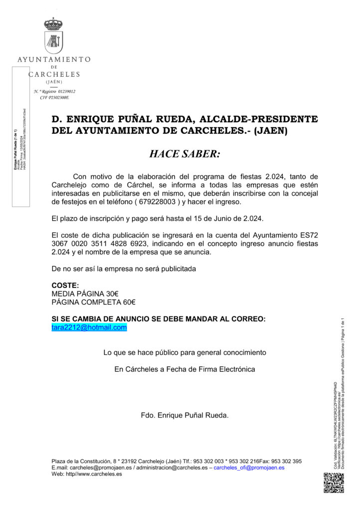 Con motivo de la elaboración del programa de fiestas 2.024, tanto de Carchelejo como de Cárchel, se informa a todas las empresas que estén interesadas en publicitarse en el mismo, que deberán inscribirse con la concejal de festejos en el teléfono ( 679228003 ) y hacer el ingreso.